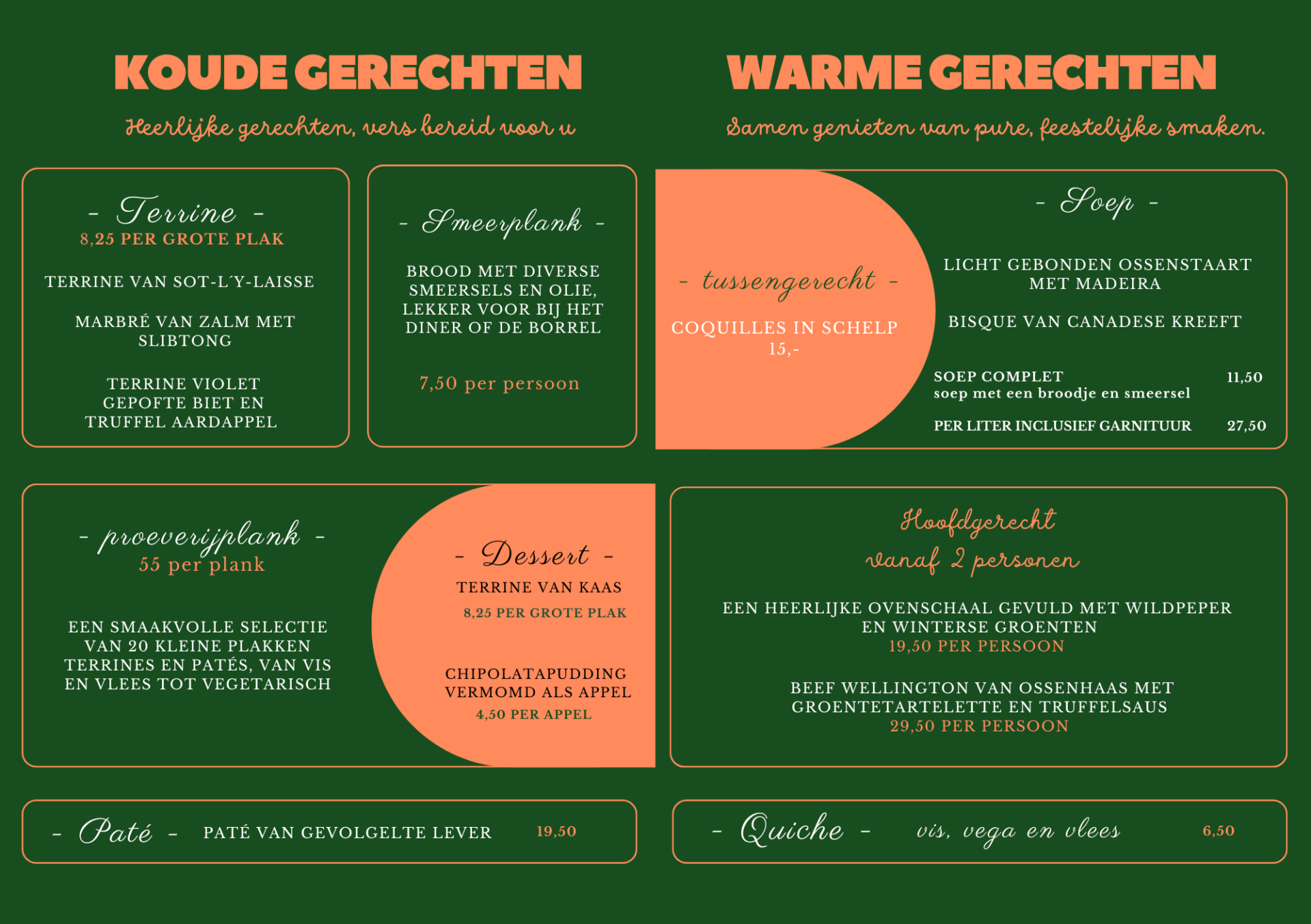 Onze kerstspecialiteiten variëren van de klassieke Beef Wellington – met malse ossenhaas, omhuld door een gouden korst – tot elegante terrines in verschillende smaakvarianten, die zowel het oog als de smaakpapillen verwennen. Begin je diner met een van onze huisgemaakte, hartverwarmende soepen of terrines en sluit af met een feestelijk dessert dat zorgt voor een perfecte zoete afsluiting. Elk gerecht wordt met liefde bereid door onze chef, met aandacht voor kwaliteit en verfijning.
